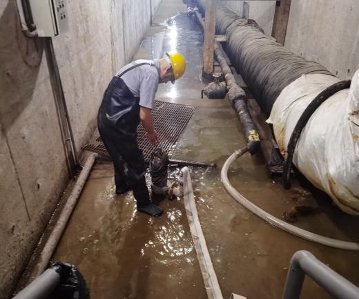 江東南路地下管廊6號(hào)泵故障,廊內(nèi)積水嚴(yán)重,迅速前往檢修。912日接到檢修任務(wù)后,新城物業(yè)的工程人員立即穿上防護(hù)服、戴上安全帽、攜帶備用水泵、消防水帶等檢修設(shè)備到達(dá)管廊內(nèi)的搶修點(diǎn)。