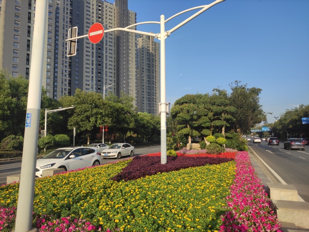 水韻路中分帶的花球也換上了新裝,10個巨大的牽?;ㄇ虮患t黃色的花帶簇?fù)碇?,在太陽下盡情地綻放著,像是小孩的笑臉,歡快地為祖國母親慶生。
