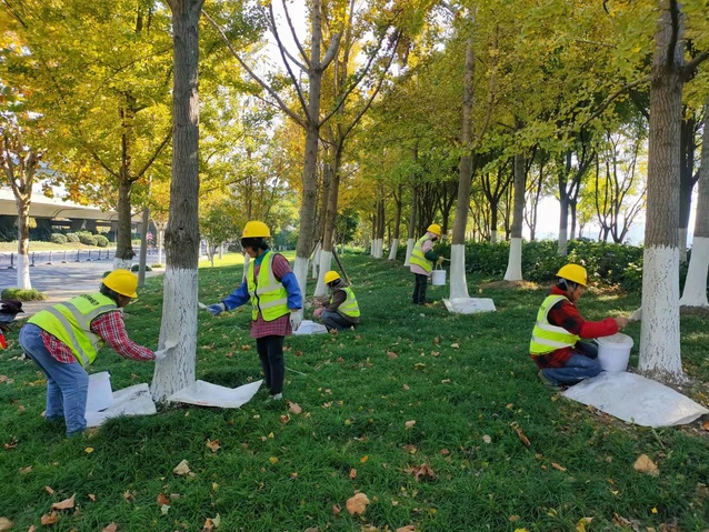 霜降過后,氣溫有了短暫的回升,但是隨著冬季到來,新一輪寒潮即將悄然來襲。為增強樹木的耐寒性及抗蟲性,近日,河西集團園林公司搶抓晴好天氣,精心組織綠化工人為南京市建鄴區(qū)、南通市崇川區(qū)等公司綠化管養(yǎng)范圍的樹木刷白“穿新衣”。