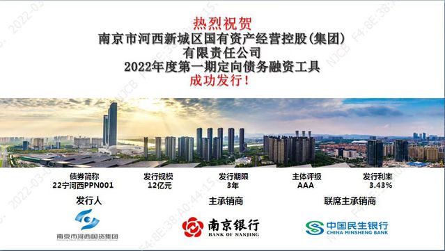 3月9日,南京市河西新城區(qū)國有資產(chǎn)經(jīng)營控股(集團(tuán))有限責(zé)任公司(以下簡稱“河西集團(tuán)”)成功發(fā)行2022年度第一期定向債務(wù)融資工具。