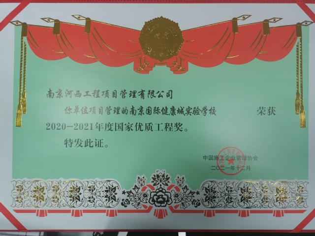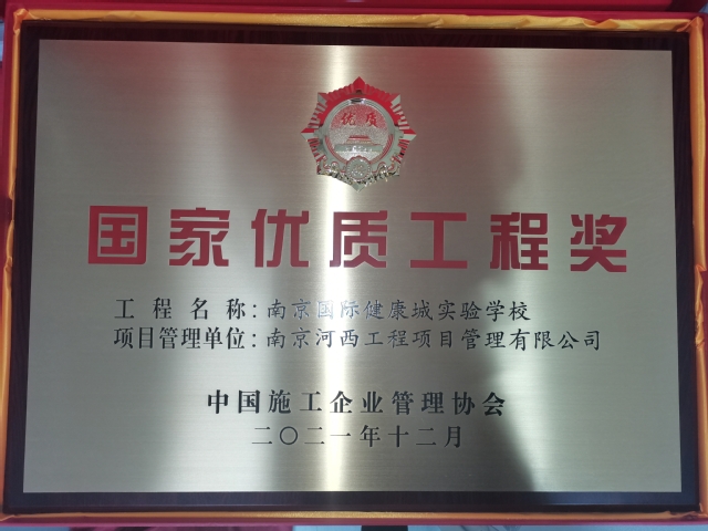 近期,河西集團新城公司所屬南京河西工程項目管理有限公司代建的南京國際健康城實驗學(xué)校項目項目喜獲“2020-2021年國家優(yōu)質(zhì)工程獎”。