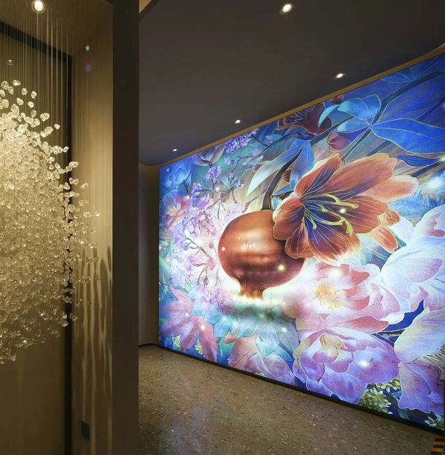 “人間歡喜事,石榴成熟時(shí)”,藝術(shù)生活館中一幅瑰麗絢爛的手繪花神圖渲染出主題氛圍,鮮花簇?fù)眍w粒飽滿石榴的畫(huà)幅,姹紫嫣紅中,將奧體公司開(kāi)發(fā)的奧體新城各小區(qū)名稱(chēng)中的植物元素有機(jī)組合在一起,觀眾置身其中,仿佛能聞到花的芳香、看到石榴籽的晶瑩剔透。畫(huà)面寓意著花開(kāi)興隆、興旺昌盛,祝福幸福美好生活紅紅火火,也體現(xiàn)了河西集團(tuán)“開(kāi)發(fā)幸福、運(yùn)營(yíng)美好”的經(jīng)營(yíng)理念。整幅花神圖由特邀手繪師親繪而成,十分珍貴。