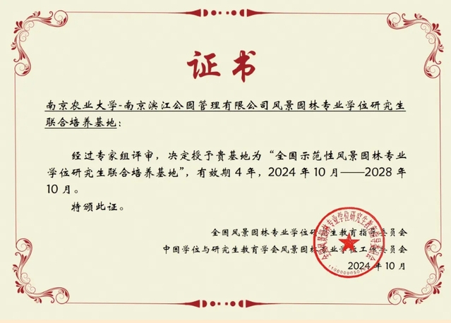 近日,全國風景園林專業(yè)學位研究生教育指導委員會正式公布了2024年“全國示范性風景園林專業(yè)學位研究生聯(lián)合培養(yǎng)基地”名單。南京濱江公園管理有限公司與南京農(nóng)業(yè)大學合作共建的“南京農(nóng)業(yè)大學—南京濱江公園管理有限公司風景園林專業(yè)學位研究生聯(lián)合培養(yǎng)基地”,憑借卓越的聯(lián)合培養(yǎng)成效和深厚的校企合作基礎,再次獲此資質(zhì)。